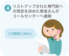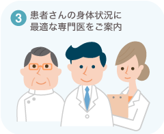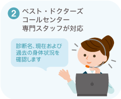 - ●コールセンタースタッフが診断名、現在および過去の身体状況をヒアリングし、患者さんの身体状況に最適な専門医をご案内します。